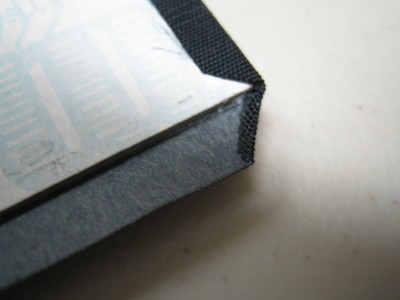 Position the book on the cover material and allow 4 board thicknesses along the front edge. Wrap the cloth tightly around and cut it off allowing 4 board thicknesses at the back edge.