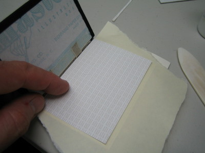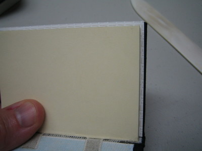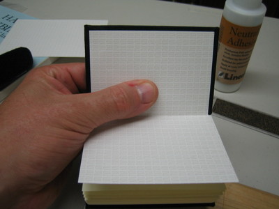 Before folding the liner, check the fit against the inside cover. When you are satisfied that it is centered, make the fold. Because of small errors in the square, the loose page may not be perfectly aligned with the book block. That's why it was cut oversize.