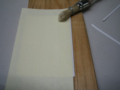 A 1/16" stripe of glue is applied to the edge of the folded endpaper where it will attach to the inner edge of the first endsheet. (The oversized page of the liner is the one being glued.) Use a disposable barrier sheet to expose only the 1/16 inch.