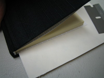 Using a razor blade and a thick backing sheet to protect the book, cut around both endsheets so they are flush with the book block.