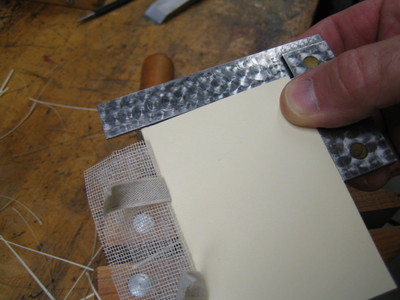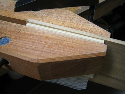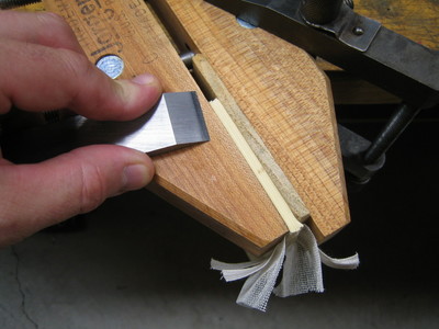 There is a fun set of tools called a laying press, plough and tub that I'll probably make someday. For this small book, I used an ordinary wood chisel and a woodworking clamp. A clean woodworking vise would work even better.