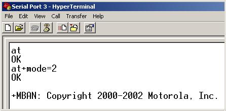 Once you've got the settings right, you are ready to test the phone. Close the properties windows and press the "Call" button below the main window menu bar. Now for the moment of truth: Type the letters AT and the the Enter key. If all is well the phone will reply with "OK". Next type the command AT+mode=2 as shown below. The phone will reply with the +MBAN banner. When you get this far, the phone is almost certain to work with MotoBackup and MotoRestore.