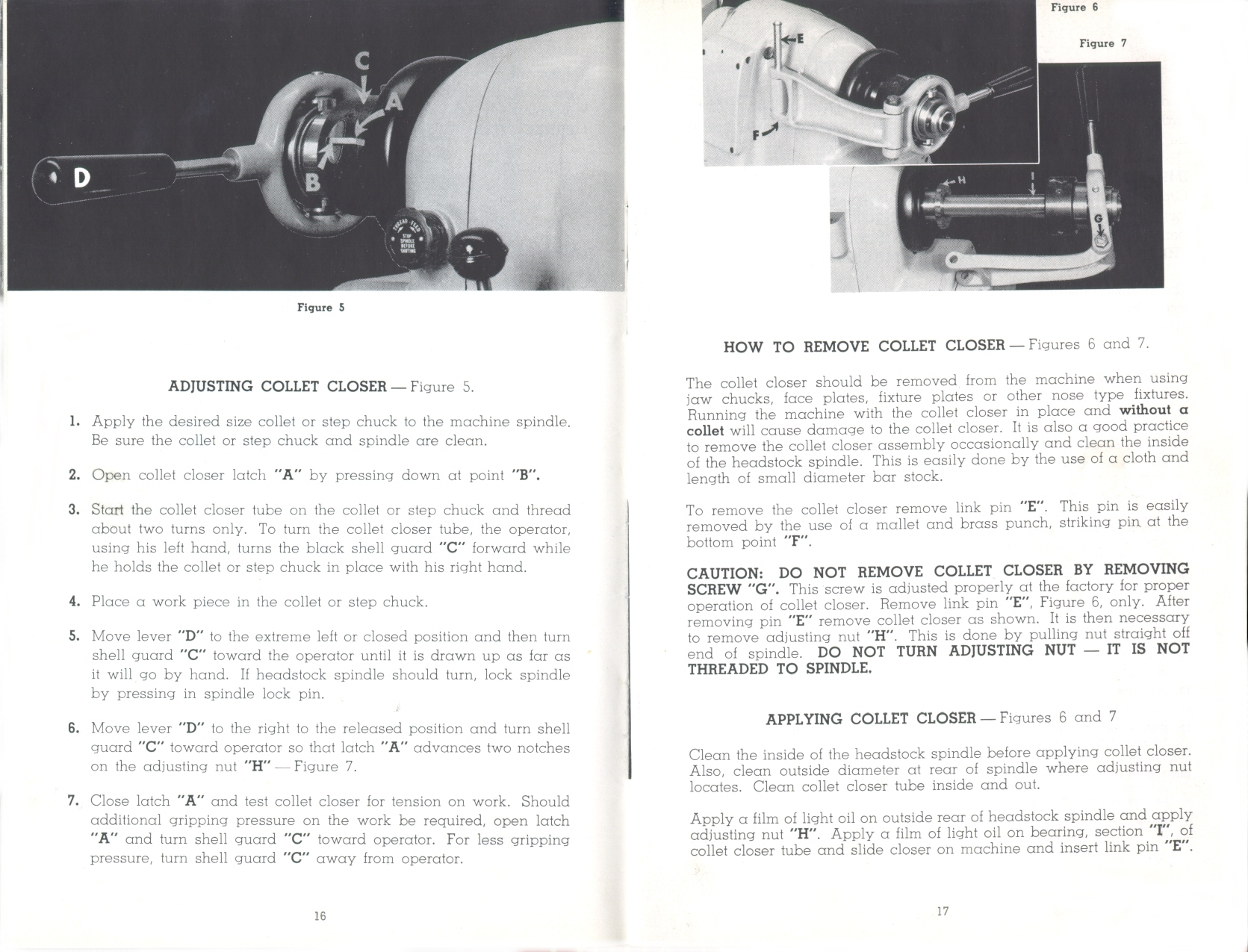 Page 16-17: Adjusting collet closer, Removing collet closer
