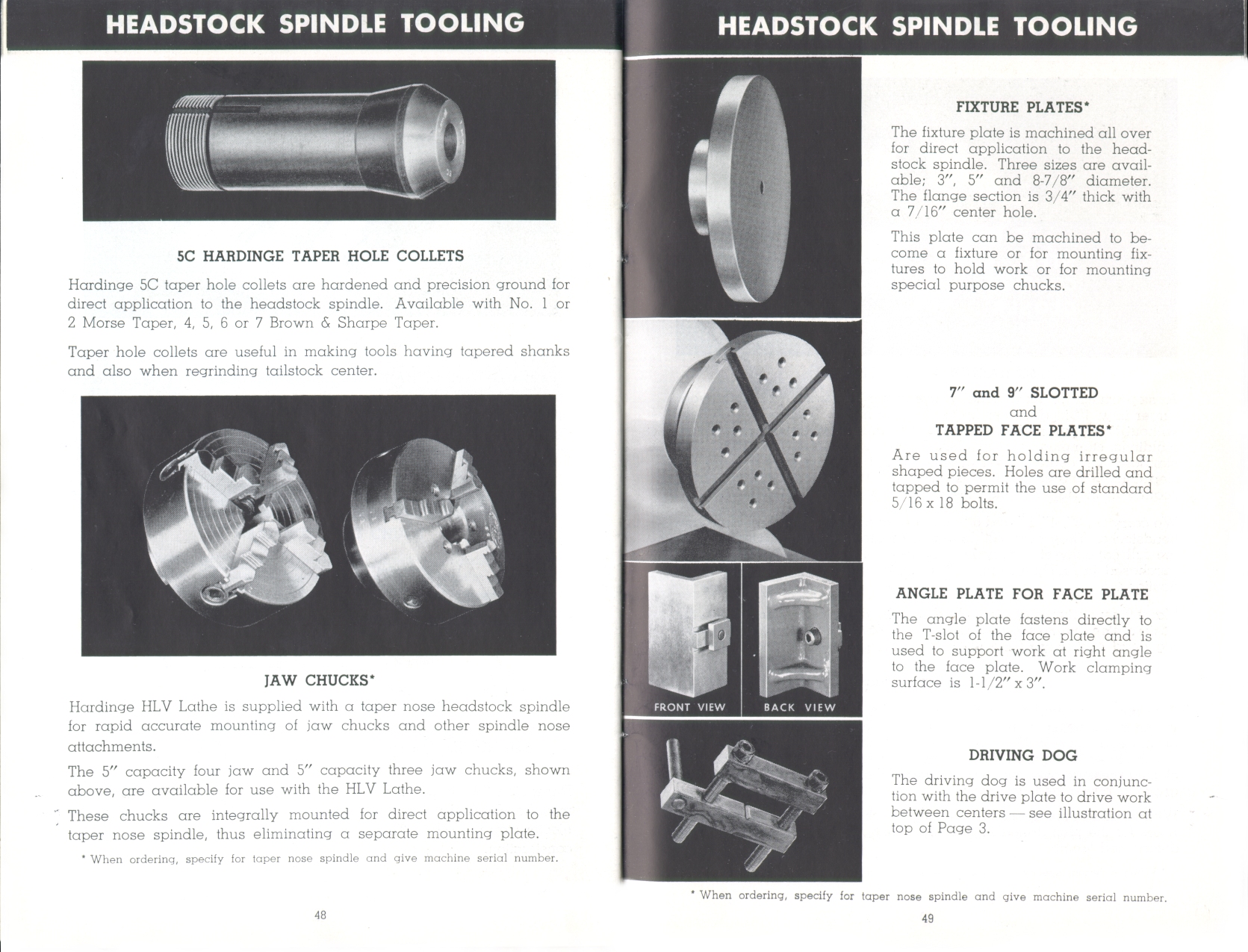 Page 48-49: Taper hole collets, jaw chucks, face plates, driving dog