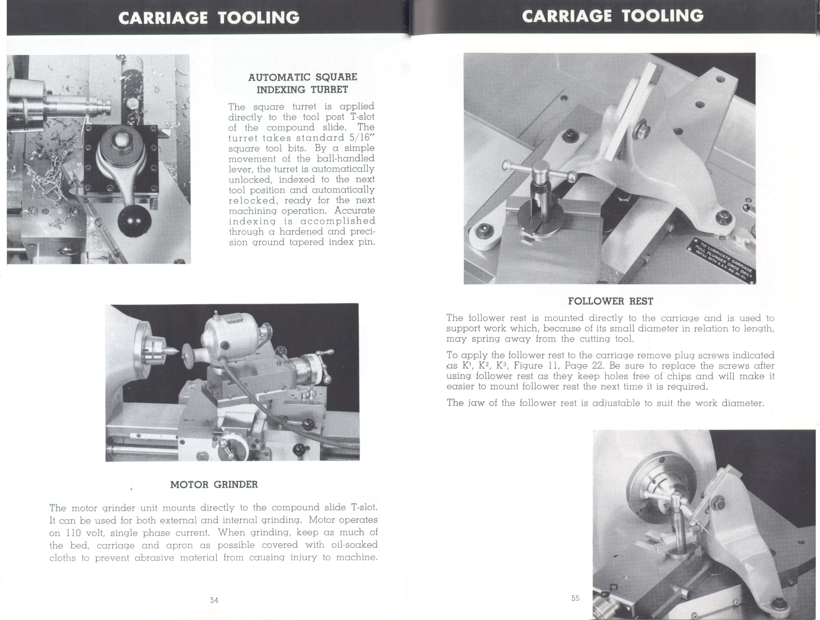 Page 54-55: Indexing turret, toolpost grinder, follower rest
