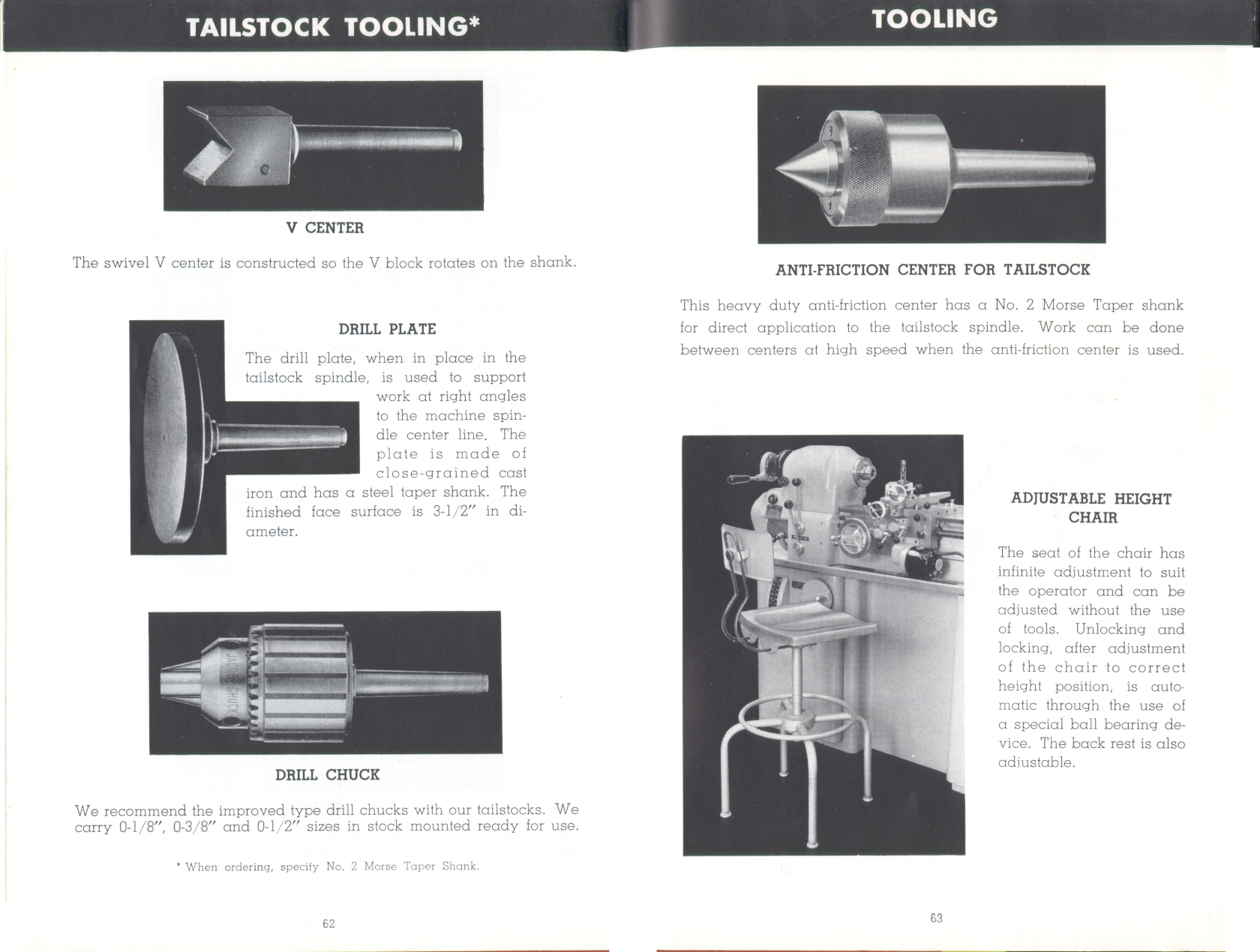 Page 62-63: V-center, drill plate, drill chuck, live centers, chair