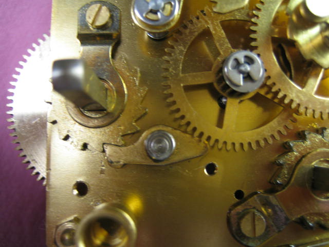This clock has three barrels: time, chime, and striking. The broken spring hold the rachet pawl on the left most side of the photo below.