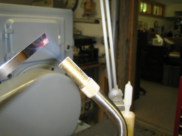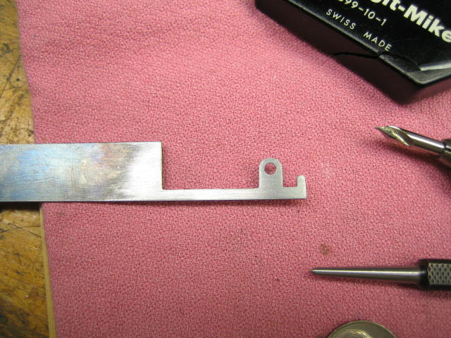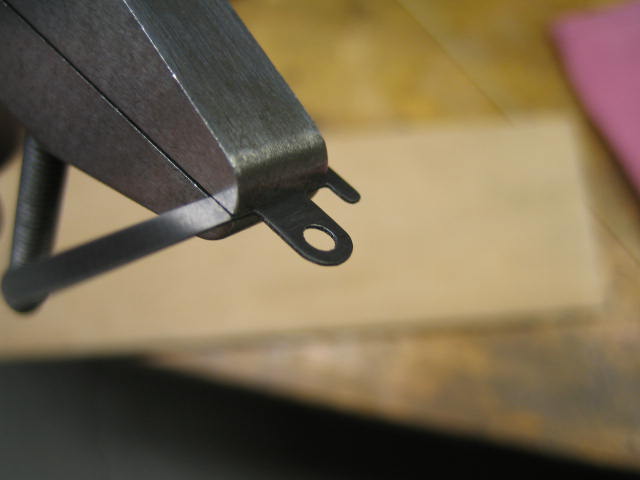 This is the second try for this part. The first time, I broke off the tab with the hole when I tried to bend the right angle. I thought I'd annealed the shim stock. For the second try, I heated the part and the tongs, bending about 20 degrees per heat.