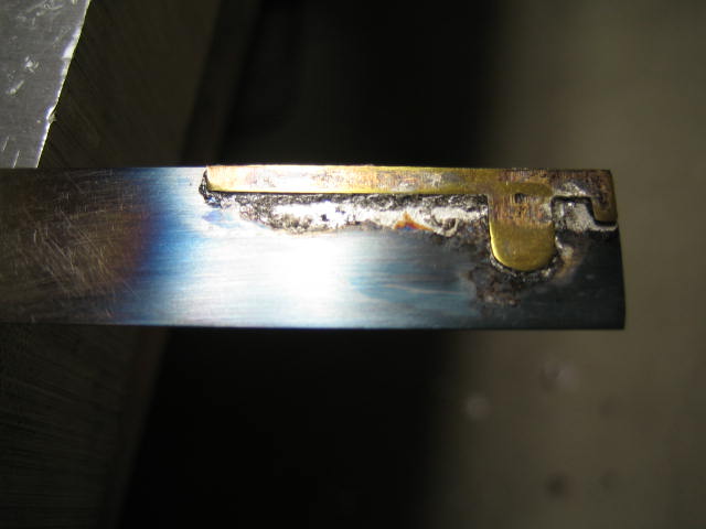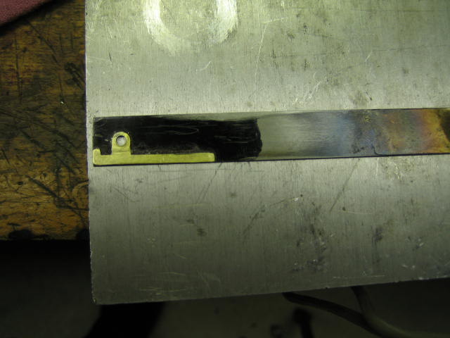 To solder the parts and keep them precisely aligned with the reference edge, I tin both surfaces and wipe them to get a very thin solder layer on both. Then I clamp the parts with bent wire springs and heat them together.