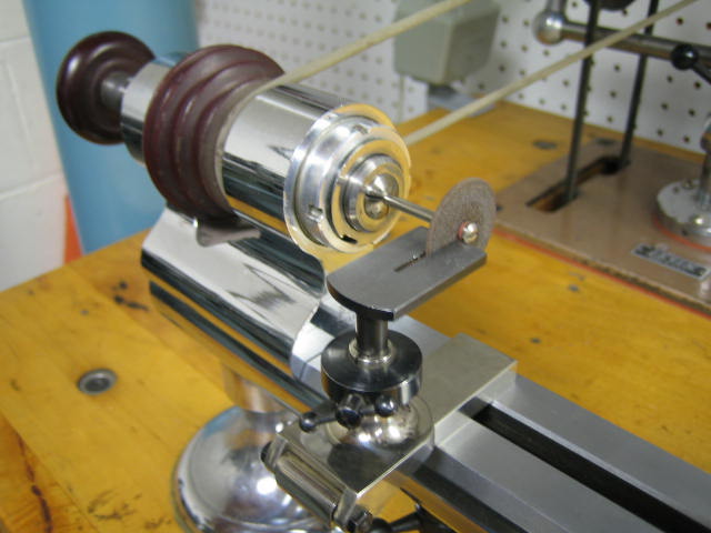 The wheel is driven in the watchmaker's lathe at fairly high speed. The part and template are supported on a saw table. The table should be precisely on-center and the slot should closely fit the wheel. For fine work, I attach a fresh sheet metal plate to the saw table and saw a new slot using the wheel.
